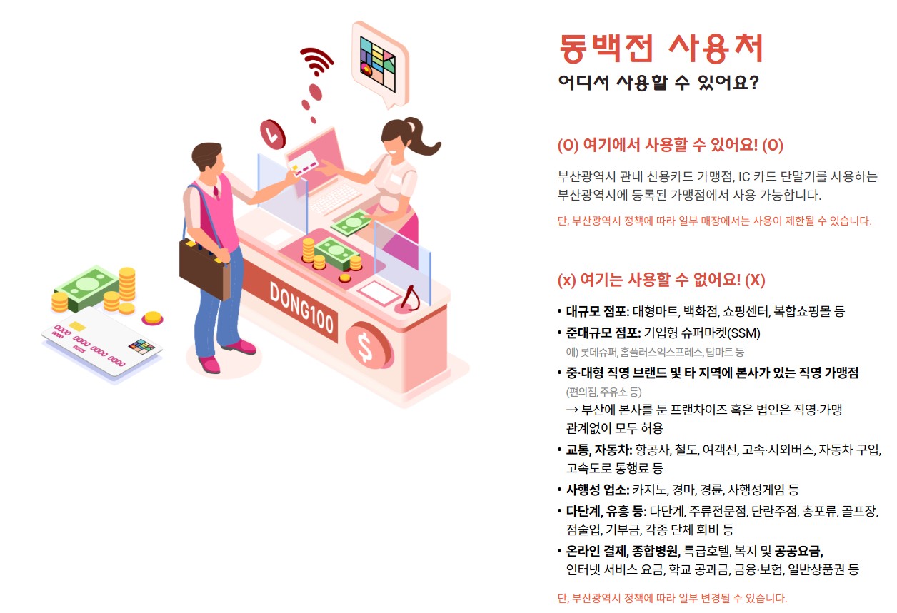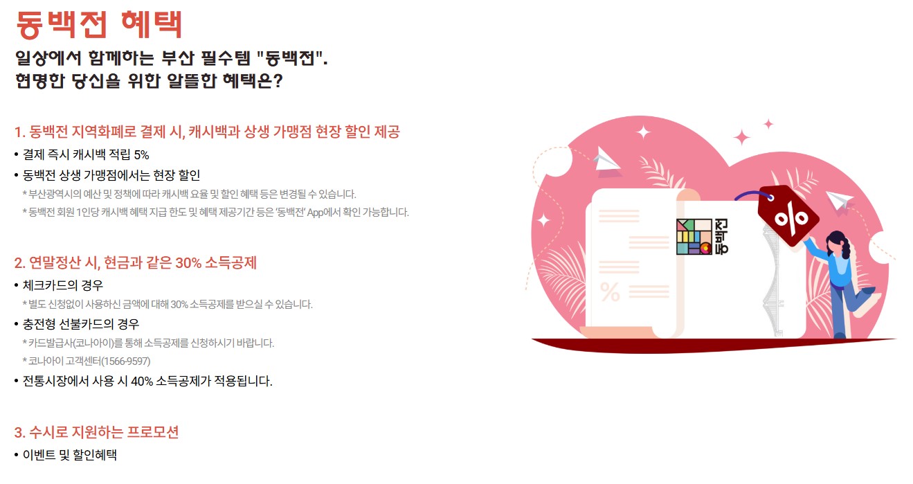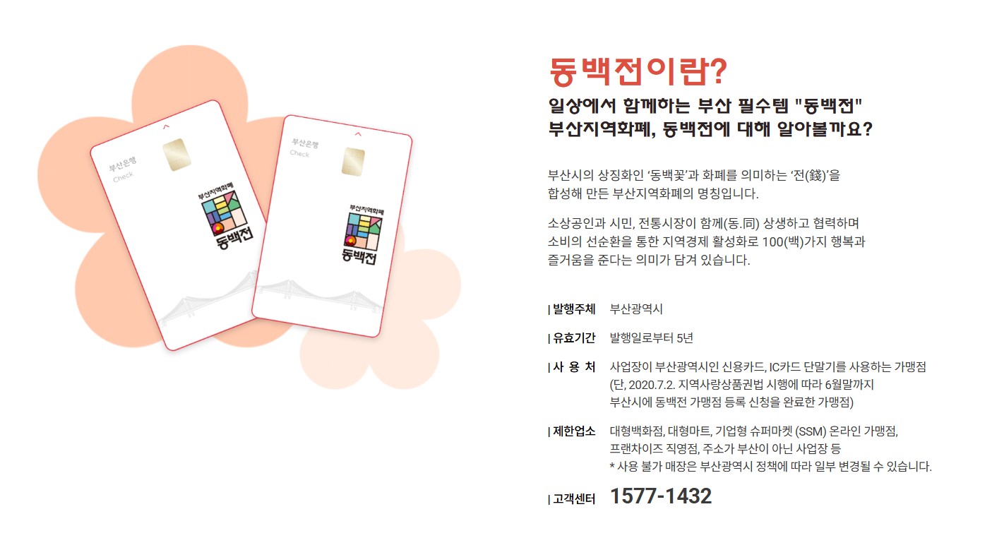 부산의 대표적인 꽃인 동백꽃의 이름을 따서 만든 동백전은 소상공인, 시민을 위해 만든 지역화폐로